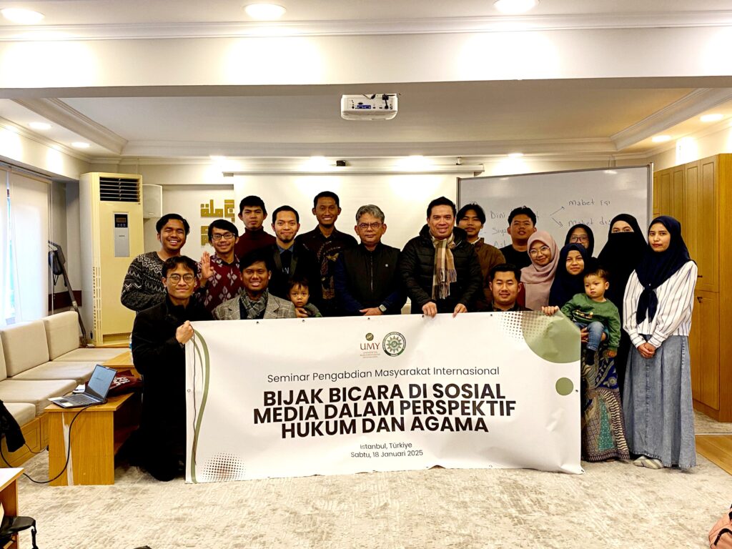 Istanbul, Turki – Universitas Muhammadiyah Yogyakarta (UMY) bekerja sama dengan Pimpinan Cabang Istimewa Muhammadiyah (PCIM) Turki sukses menyelenggarakan Seminar Pengabdian Masyarakat Internasional bertema “Bijak Bicara di Sosial Media dalam Perspektif Hukum dan Agama”. Kegiatan ini berlangsung pada Sabtu, 18 Januari 2025, di Istanbul, Turki, dan menghadirkan tiga narasumber berpengalaman di bidang hukum, agama, dan literasi media.